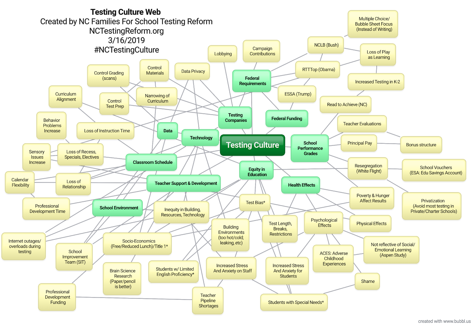 The Testing Culture “Web” Diagram was constructed to demonstrate how the various issues of public school testing are related and connected.